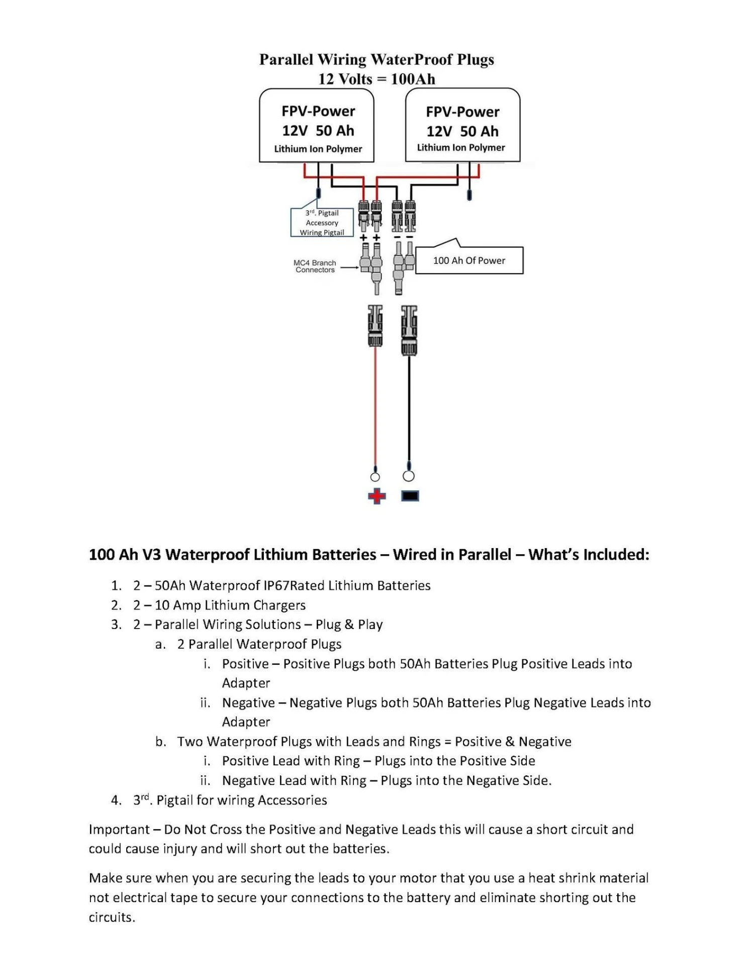| Product Description | FPV-POWER 100AH V3 WATERPROOF LITHIUM BATTERY – (2) 50Ah V3 Batteries in Parallel / Paralle Wiring Harness -WITH (2)10AH CHARGER2 |